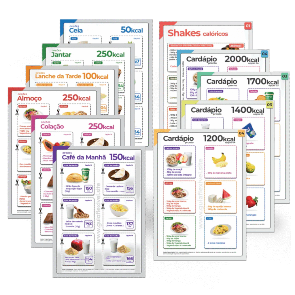 +140 Cardápios Semanais Flexíveis Montados, Calculados e Divididos Entre 1.200 até 1.900 Calorias Diárias Para Todas as Fases do Emagrecimento